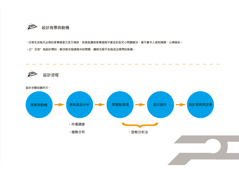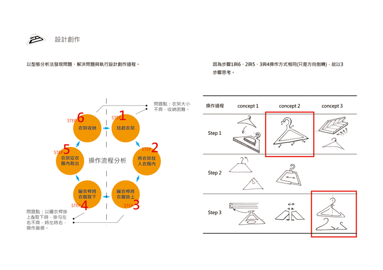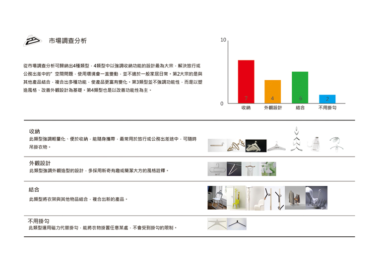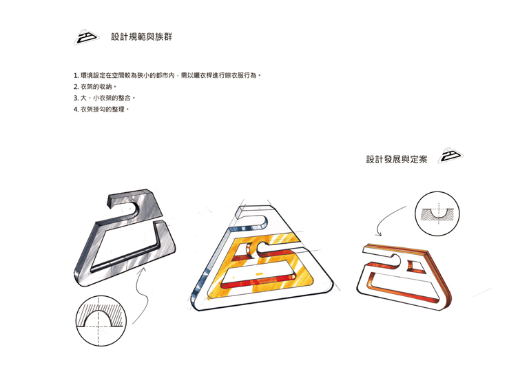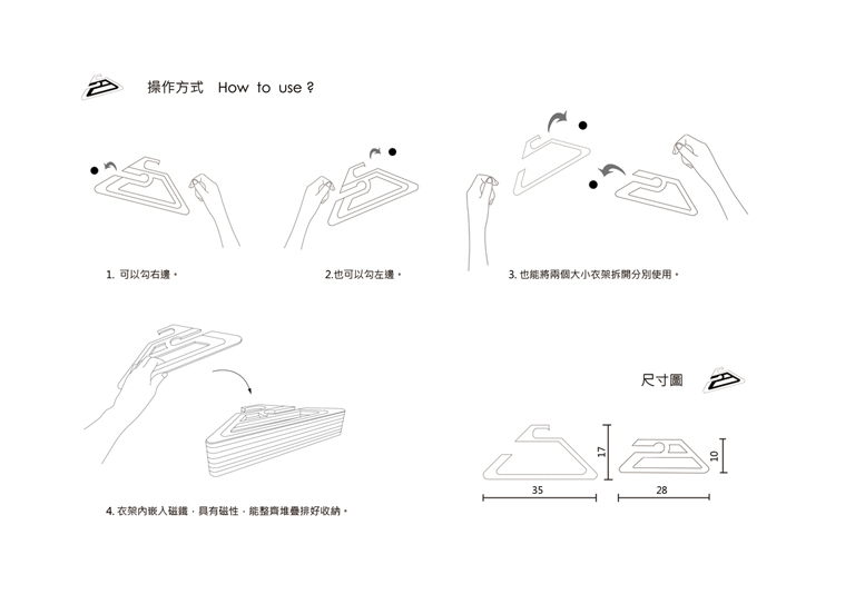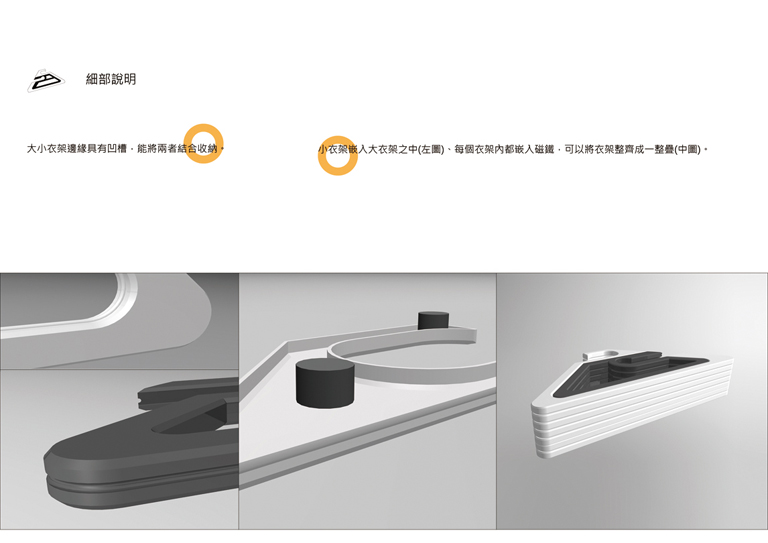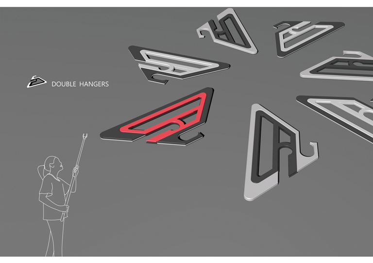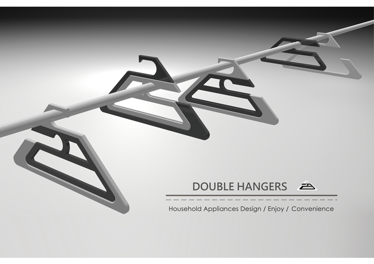 觀察家庭中常見的生活用品,挑選『衣架』為設計標的,透過市場調查與操作分析,並且以都市化環境的生活型態為背景,探討其使用需求;發現"收納不便"是使用時最常見的問題,因此針對此問題點提出設計方案 - double hangers,以磁性材料製作,並且讓大、小衣架可結合或拆開的方式運用,解決日常生活中的細碎困擾。。